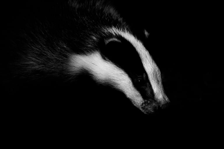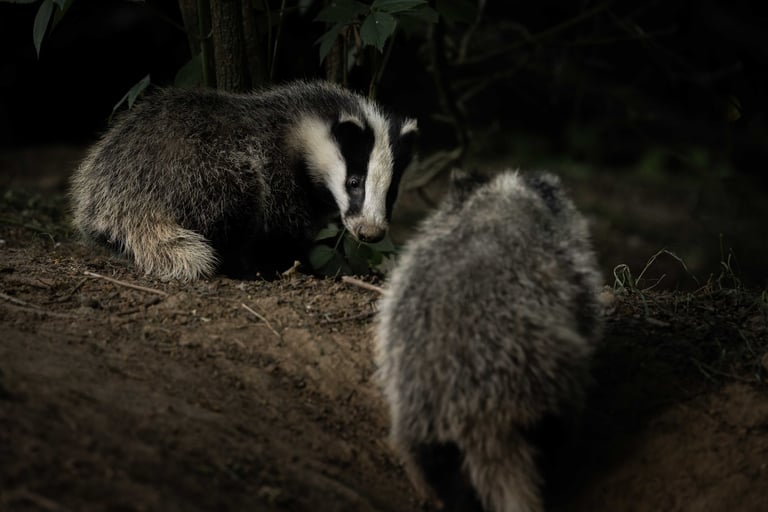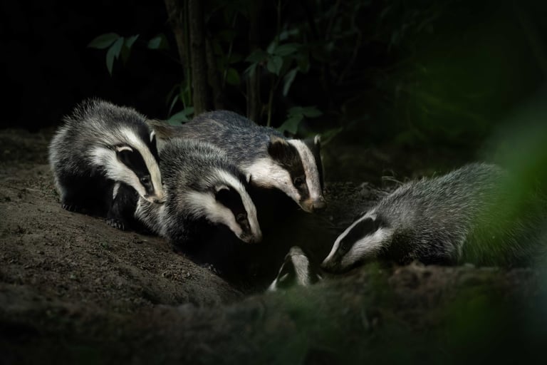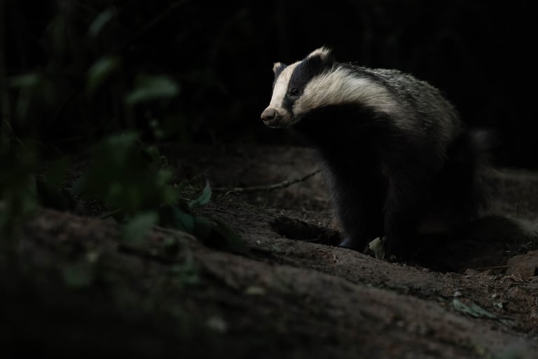 Although a lot of memories from my childhood are long forgotten, I distinctly remember a family holiday to France, when I was around 9 years old. My uncle asked me which animal I would liked to see and without skipping a beat I said badgers. Where I got this desire from I have no clue, but what I do remember is that I would have to wait until after the holiday, as we (of course) didn't see any badgers. Since then, I've spent quite a few evenings near badger setts. Usually spending hours waiting, for nothing in return. A few years back I got lucky, and got my first shots, beside my first sightings that were longer than an animal crossing a road or running into the bracken (see: Eifel 2023). Better images were always still on the back of my mind though. My job has got me working on a project where we've got quite a few badger setts. So knowing I would have to be in a hotel (meaning I'd spend my evenings in the area) I already started thinking of where I might be able to get some shots. I tried 2 different locations, two nights at the first one without sightings, making me decide to move to another sett. I positioned myself downwind, and waited. This location was in woodland, so far darker than the first one, but the sett itself was larger. After about half an hour of waiting (I was expecting at least an hour) I saw a tuft of grey hair poking out. A few seconds later, the first badger left the sett. After a short rummage it went back in, to come back out followed by another adult and 4 youngsters. I was incredibly fortunate to spend the evening watching these beautiful creatures play, wrestle, run about, prune and clean. Although I've had to wait 18 years, my childhood craving for badger was satisfied, what incredible animals. Despite bad light I got quite a few shots that I'm super happy with, although nothing will beat seeing the youngsters play at a distance of just 2 meters.