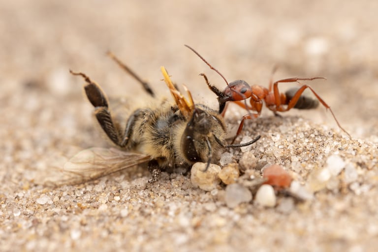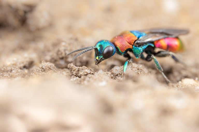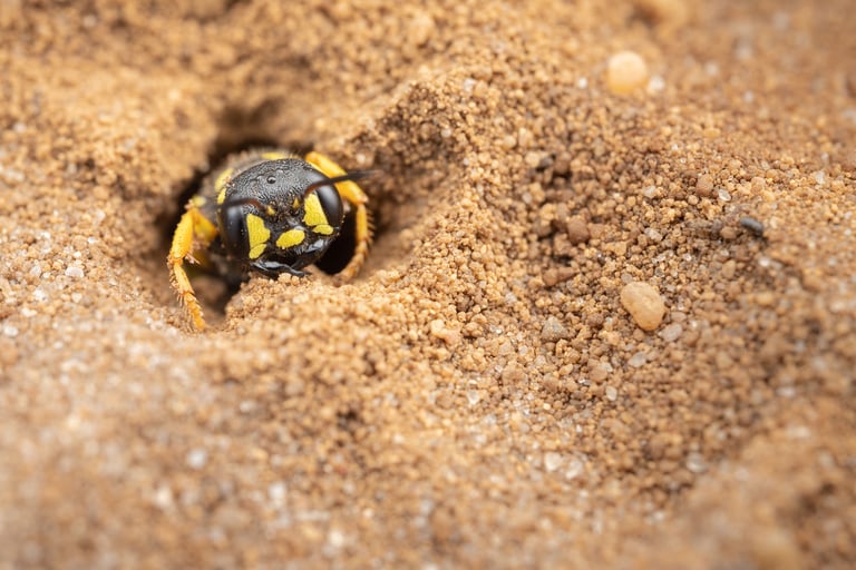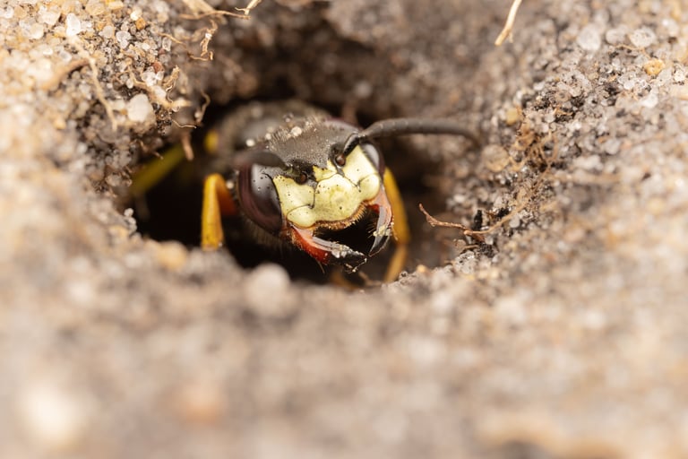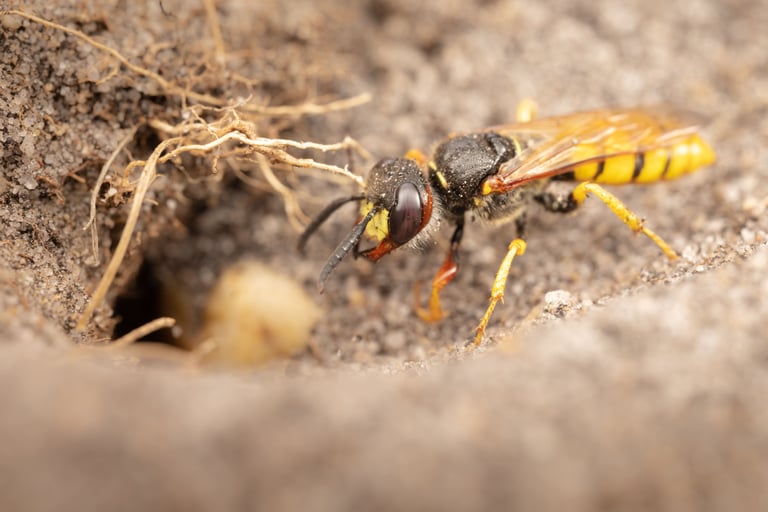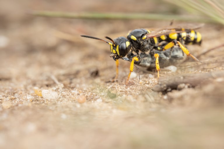 A day on the Veluwe with one of my best friends, looking for snakes, went rather unsuccesful when it came to snakes. The day was a big succes when it came to laughs and bugs tho, allowing me to photograph bee wolves (Philanthus triangulum), Cerceris arenaria and a beautiful cuckoo wasp (Hedychrum nobile). The bee wolves and C. arenaria are parasites, the species respectively preying on bees and weevils. The cuckoo wasps are brood parasites of the parasitic wasps, preying on their larvae, this species of cuckoo wasp especially preying on the larvae of C. arenaria!