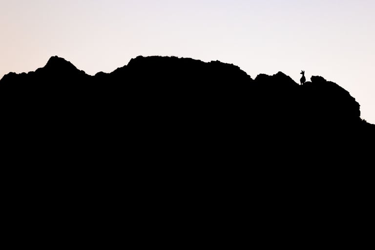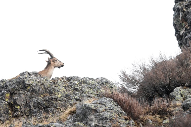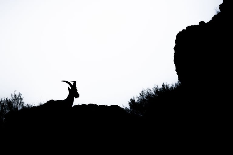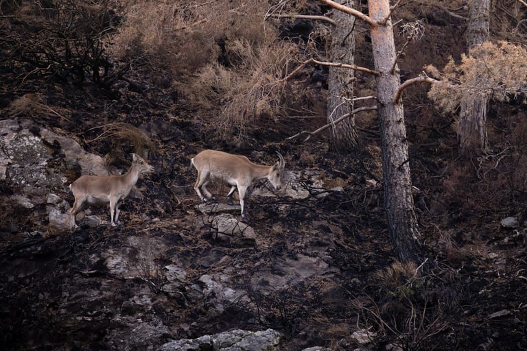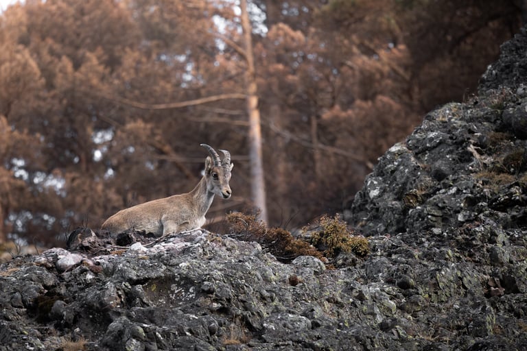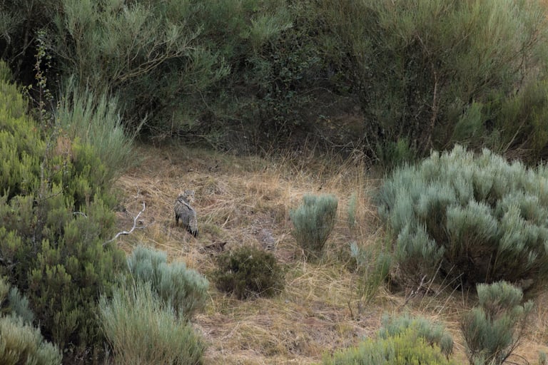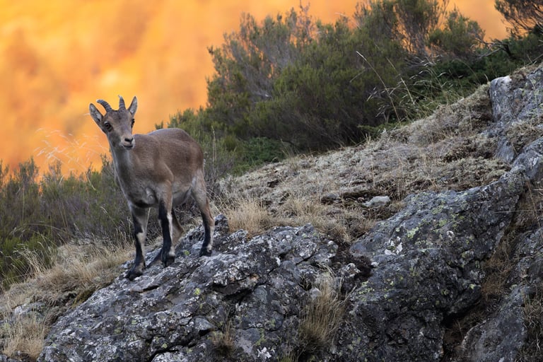 Onto the next area after this, where we were going to be looking for wildcats. We found the first one while using the thermal camera on the way to the accomodation that evening, but pictures would have to wait until the next morning. Before discovering the wildcat though, we had already found another big target: Spanish ibex (Capra pyrenaica). The sun was setting quickly, but the ibex stuck around close enough to still get some nice shots. The entire valley was burnt down here, except for a small part where we found the ibex. Quite a dramatic view when they walked into the burnt area.
